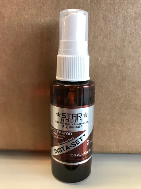 INSTA-SET™ is a catalyst which acts as an accelerator that allows CAs to quickly cure in thick layers by enhancing the alkaline conditions during polymerization. INSTA-SET™ in a spray bottle is normally used to cure the CA that flows from joints when parts are pressed together. Applying an additional bead of thick CA along a seam and then curing it with INSTA-SET™ significantly enhances a joint’s strength. For difficult to bond materials, INSTA-SET™ can be applied to one surface and CA to the opposite surface. When brought together, they will bond instantly. INSTA-SET™ is formulated with a strawberry scent and activates CA in 6 to 8 seconds without any degrading of the CAs strength, which can occur with many other accelerators. It is compatible with all surfaces, even clear plastic and white foam.