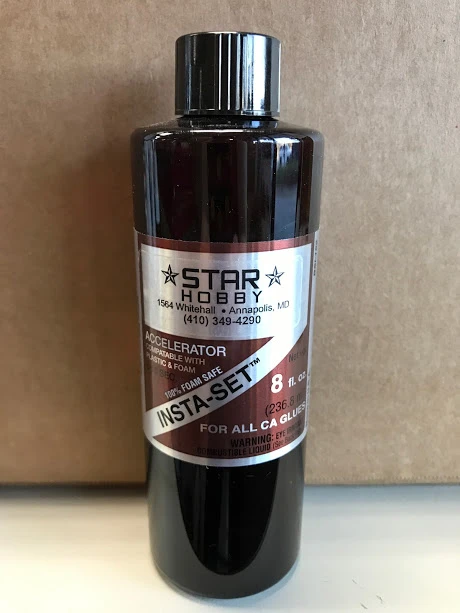 INSTA-SET™ is a catalyst which acts as an accelerator that allows CAs to quickly cure in thick layers by enhancing the alkaline conditions during polymerization. INSTA-SET™ in a spray bottle is normally used to cure the CA that flows from joints when parts are pressed together. Applying an additional bead of thick CA along a seam and then curing it with INSTA-SET™ significantly enhances a joint’s strength. For difficult to bond materials, INSTA-SET™ can be applied to one surface and CA to the opposite surface. When brought together, they will bond instantly. INSTA-SET™ is formulated with a strawberry scent and activates CA in 6 to 8 seconds without any degrading of the CAs strength, which can occur with many other accelerators. It is compatible with all surfaces, even clear plastic and white foam.