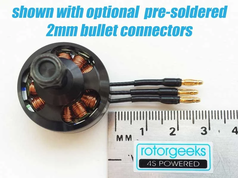 Now available with presoldered 2mm bullet connectors! These are connected directly to the enameled motor wires – shorter than many people feel comfortable doing themselves. Make your install look pro!This is the latest production batch with the upgraded Japanese NMB bearing. The new 2208 in a 2000kv version. This motor really has one purpose – to run 6″ props on 4S and hit the rpm that 2204 and 2206 class motors simply can’t reach. They’ll provide 1kg of thrust with a 6×4.5 prop on 4S and 22A of currrent draw. We recommend the Rotorgeeks 12A ESC for this motor. Sounds crazy but check out the video below. Thrust charts are below that.